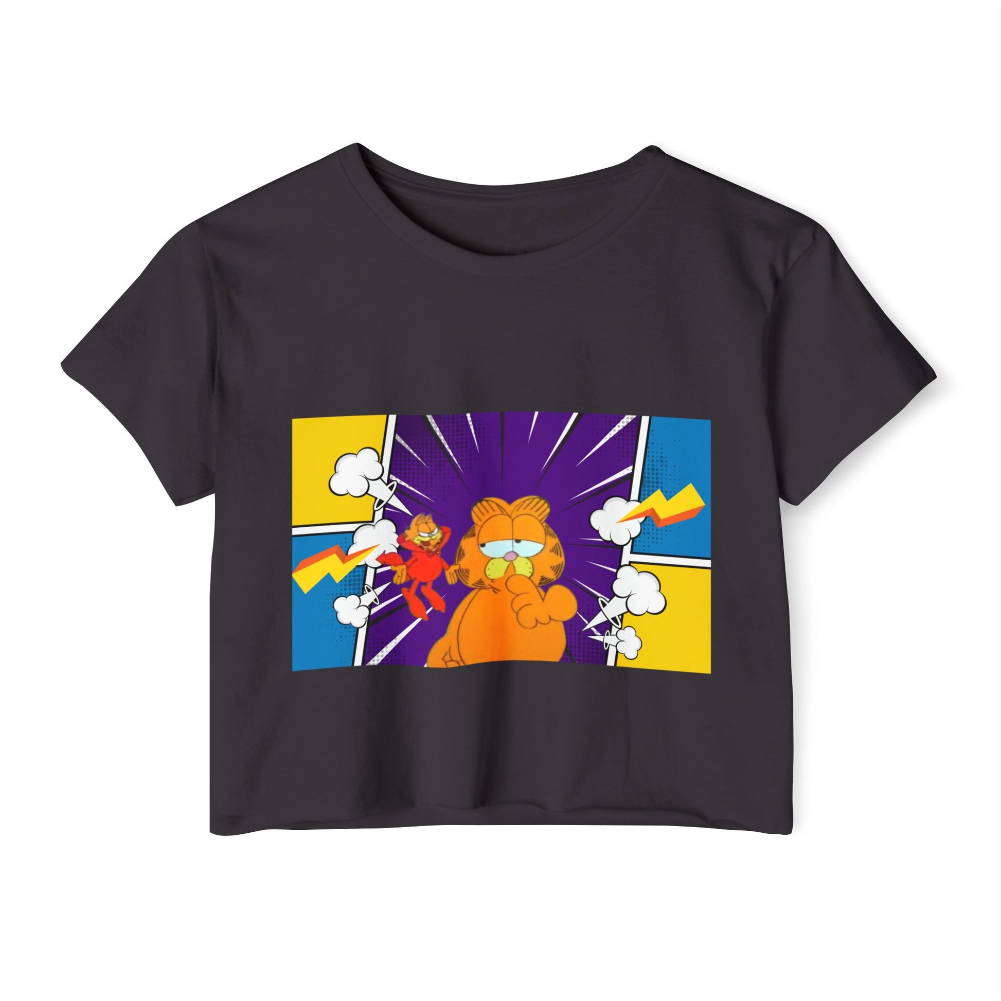 Garfield, but make it unholy. This Satan’s Children crop top throws the world’s laziest cat into a storm of comic-book madness—lightning bolts, clouds, and a bold multicolor background. Front and center, Garfield smirks as his devil-clad double floats at his ear, whispering wicked little secrets. It’s nostalgia gone feral, a perfect mix of humor, rebellion, and chaos—tailor-made for those who thrive in the storm.